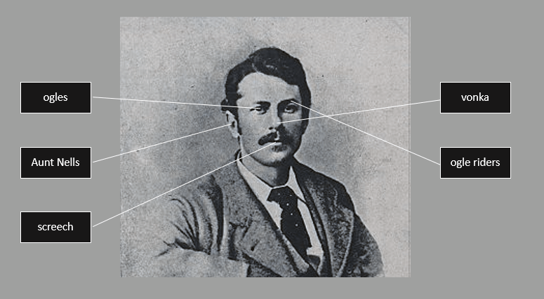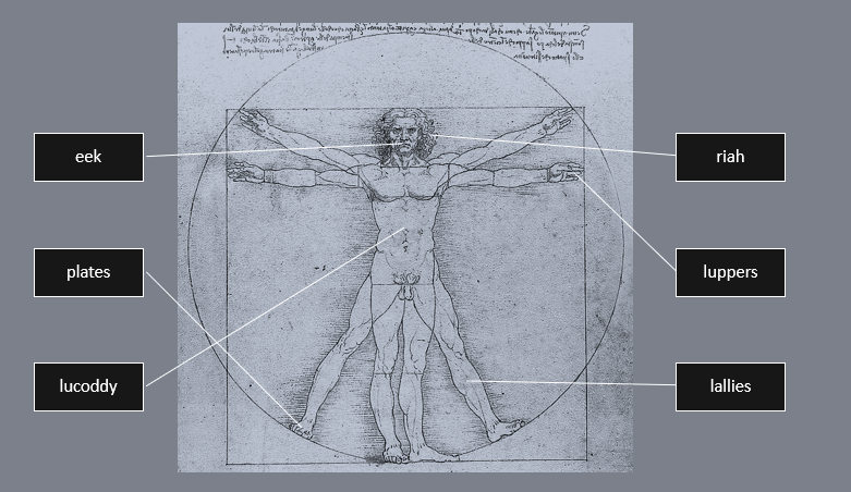 Polari has a number of terms for different body parts. In the lesson, these terms will be taught alongside example sentences. Firstly, refer to the diagrams below, before proceeding onto the vocabulary list. Be sure to refer to the ‘key vocabulary’ section below the vocabulary list so that you can understand the example sentences.